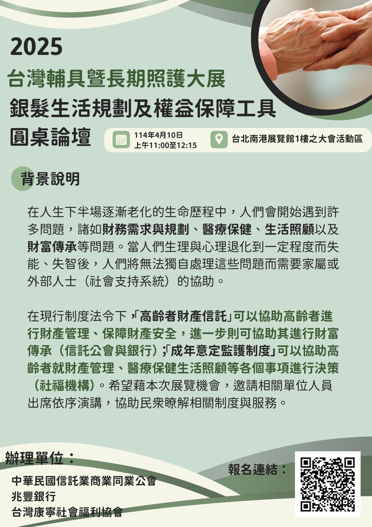 在現(xiàn)行制度法令下,「高齡者財產(chǎn)信託」可以協(xié)助其進行財產(chǎn)管理、保障財產(chǎn)安全(信託公會與銀行);成年意定監(jiān)護制度可以協(xié)助高齡者就財產(chǎn)管理、醫(yī)療保健生活照顧等各個事項進行決策(社福機構)。希望藉本次展覽機會,邀請相關單位人員出席依序演講,協(xié)助民眾瞭解相關制度與服務。