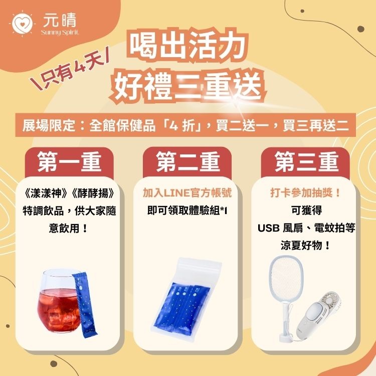 - 展場現(xiàn)場限定:全館保健品展場限定價「 4 折」,買二送一,買三送二,只有 4 天,現(xiàn)場買最劃算!