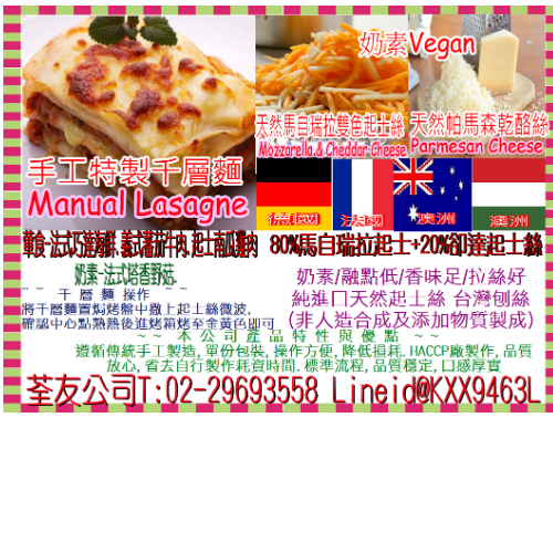 手工千層麵 為專業(yè)Haccp Iso認證工廠生產 為知名飯店 義式料理所使用之商品 只要微波加熱 灑上起士絲進烤箱烤至金黃色 即是飯店主廚的手工料理 方便操作 穩(wěn)定的品質 深受好評 是出餐用的好夥伴