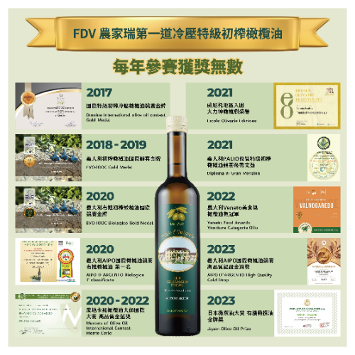 2017~2020年榮獲Domina、義大利Extra Virgin國際橄欖油競賽金牌;