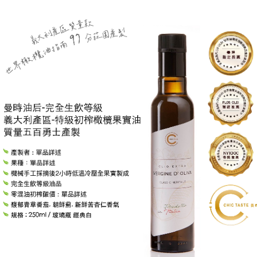 曼時(shí) 質(zhì)量款 " 橄欖油后" Chic Italia 250ml - 頂標(biāo)生飲等級(jí)特級(jí)初榨橄欖果實(shí)油