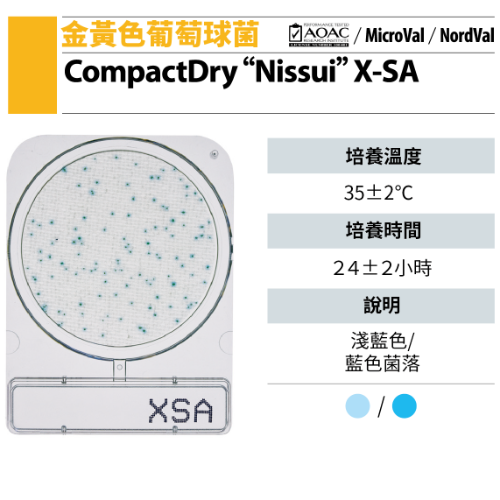 Nissui Compact Dry XSA (Staphylococcus aureus) 金黃色葡萄球菌測試片,為日本知名製藥廠日水製藥(Nissui)所研發(fā)的乾式培養(yǎng)基( Compact Dry ),Nissui Compact Dry突破微生物培養(yǎng)基無法常溫保存的限制,讓產(chǎn)品可於常溫保存長達(dá)1年。