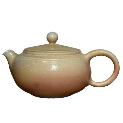 This wood-fired porcelain teapot endured seven days and nights in the flames. As wood ash settled and melted onto its surface, a soft gradient emerged—from creamy white to a gentle blush, like dawn brushing across the clouds. Unglazed yet naturally lustrous, it carries the warmth of fire and earth. The fine porcelain texture refines the tea’s sweetness and concentrates its aroma; every brew holds the lingering rhythm of time and flame. Its beauty wasn’t designed—it was written by nature itself.